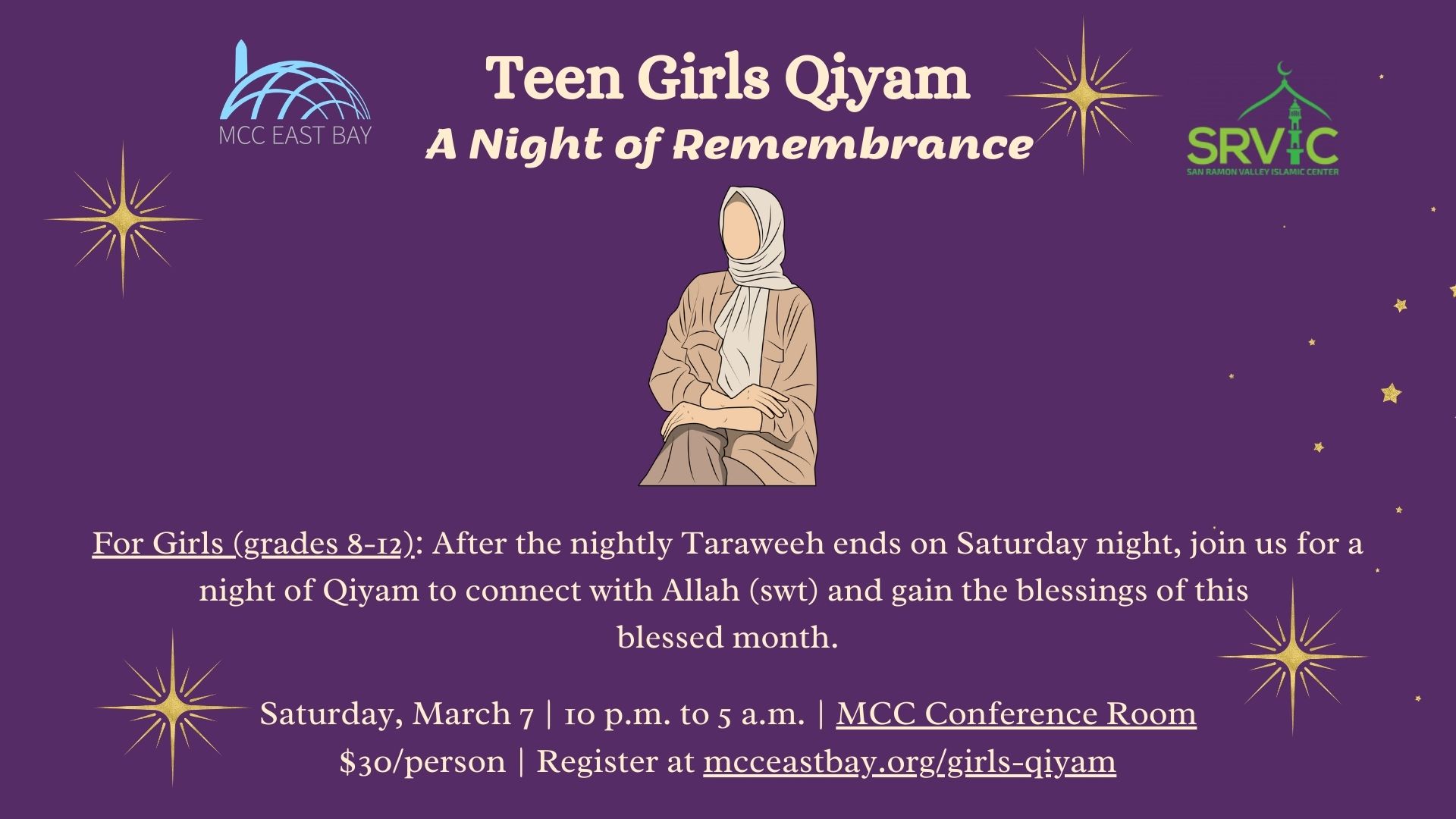 For Teenage Girls (grades 8-12): After the nightly Taraweeh ends on Saturday night (~10 p.m.), join us for a night of Qiyam led by Youth Coordinator Uroosa Shah and MCC Youth Committee to connect with Allah (swt) and gain the blessings of this blessed month. Saturday, March 7 to Sunday, March 8 | After Taraweeh prayers […]