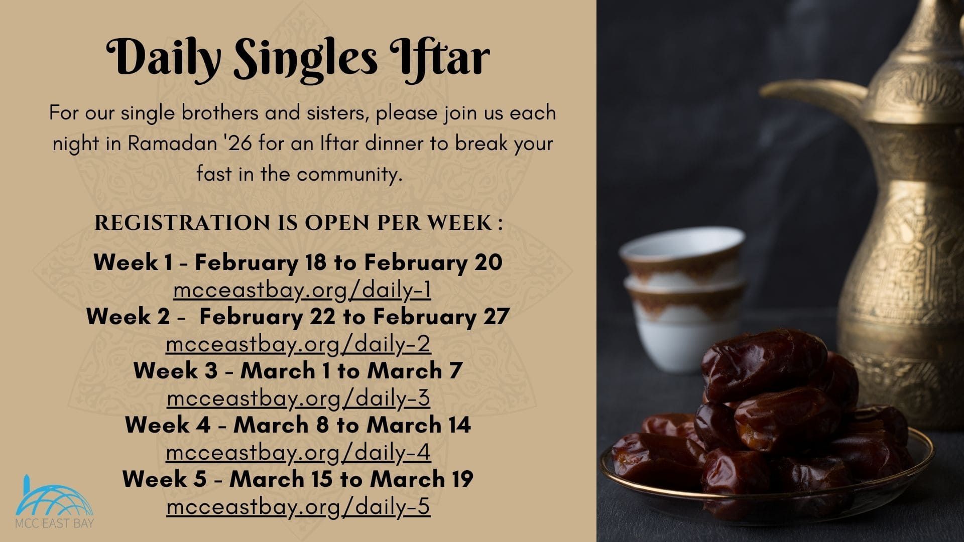 MCC East Bay 5724 W Las Positas Blvd #300, Pleasanton, CA, United StatesFor children Ages 4 to 12: Join Sister Emira Mustafa for fun-filled, creative Saturday afternoons during the blessed month of Ramadan. Create lasting memories with your kids as we craft meaningful keepsakes using high-quality materials, insha’Allah. Saturdays, Feb. 21, Feb. 28, & March 7 | 12:30 p.m. (After Dhur) to 2:30 p.m. | Ages 4 to 12 | MCC Lobby (outside the Prayer […]