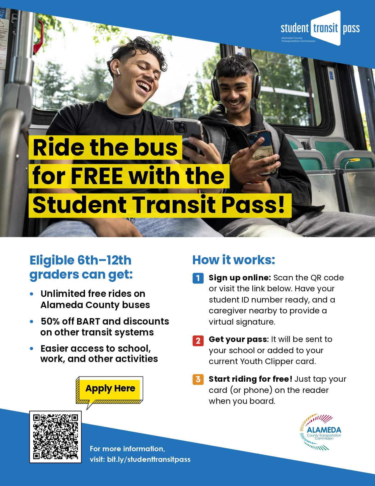 Eligible 6th–12th graders at over 160 Alameda County schools can apply for a free Student Transit Pass, which gives students unlimited free rides on local buses, 50% off BART, and other youth transit discounts. Visit the Alameda County Transportation Commission table this Friday to see if you qualify and start riding for free!