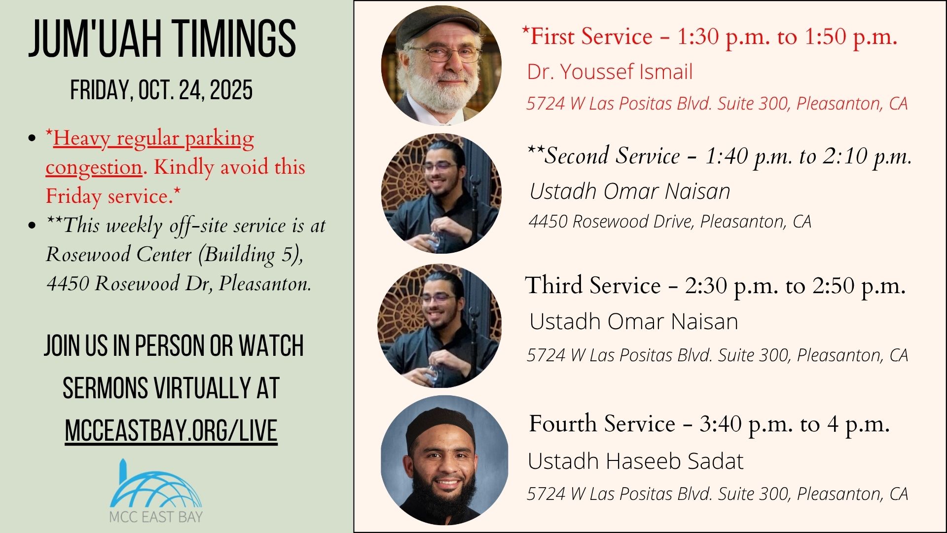 Jumu’ah Services @ MCC & Rosewood Oct 24 Featured 1:30 pm - 4:00 pm Jumu’ah Services @ MCC & Rosewood