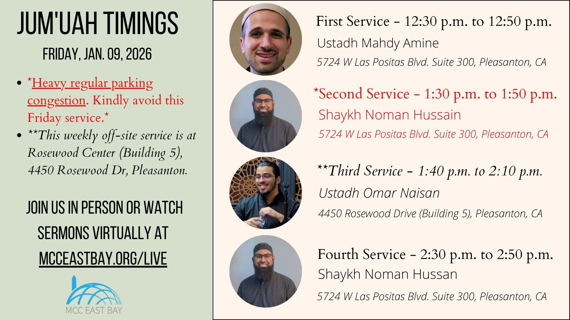Jumu’ah Services @ MCC & Rosewood Jan 9 Featured 12:30 pm - 2:50 pm Jumu’ah Services @ MCC & Rosewood