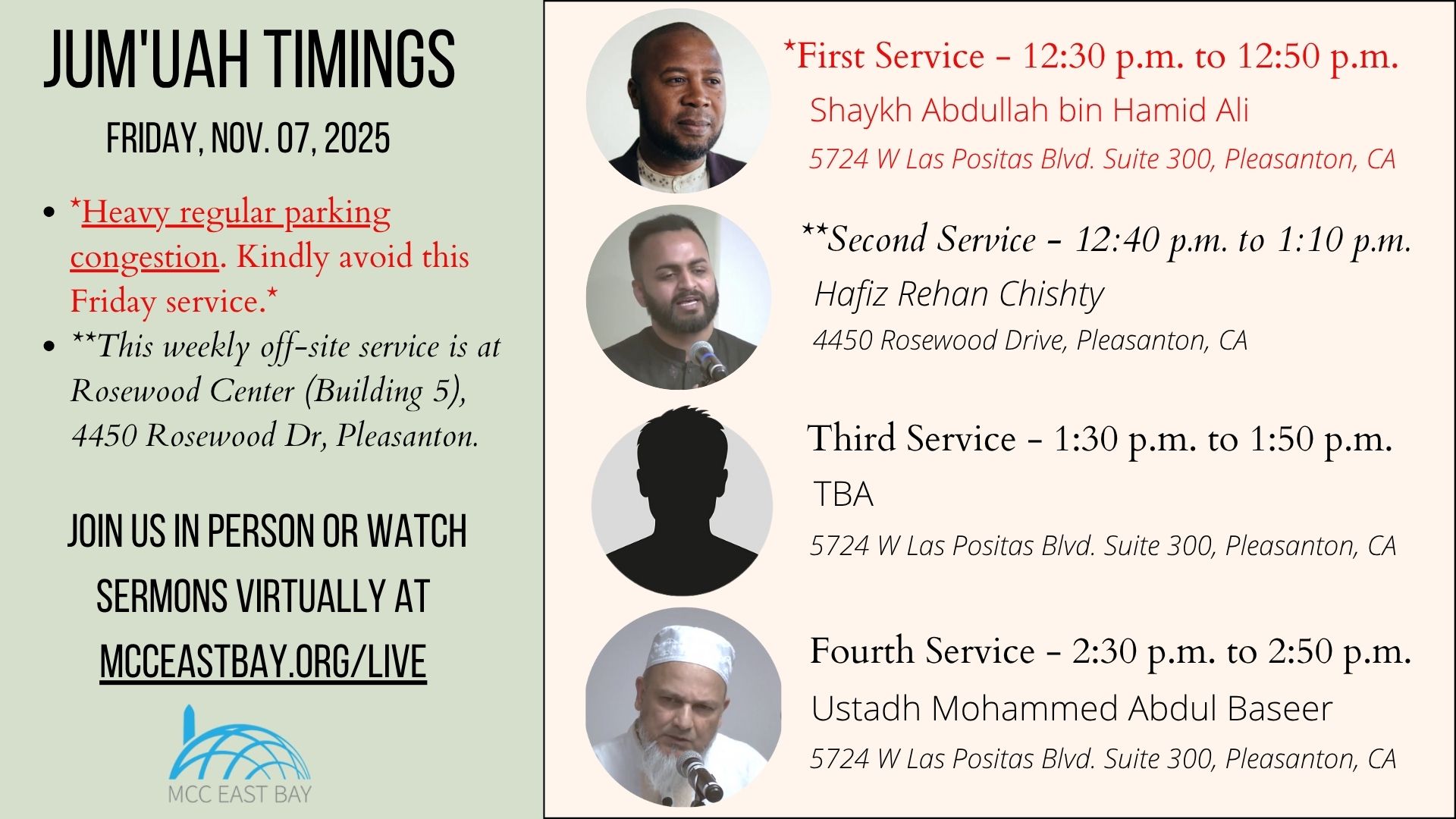 Jumu’ah Services @ MCC & Rosewood Nov 7 Featured 12:30 pm - 2:50 pm Jumu’ah Services @ MCC & Rosewood