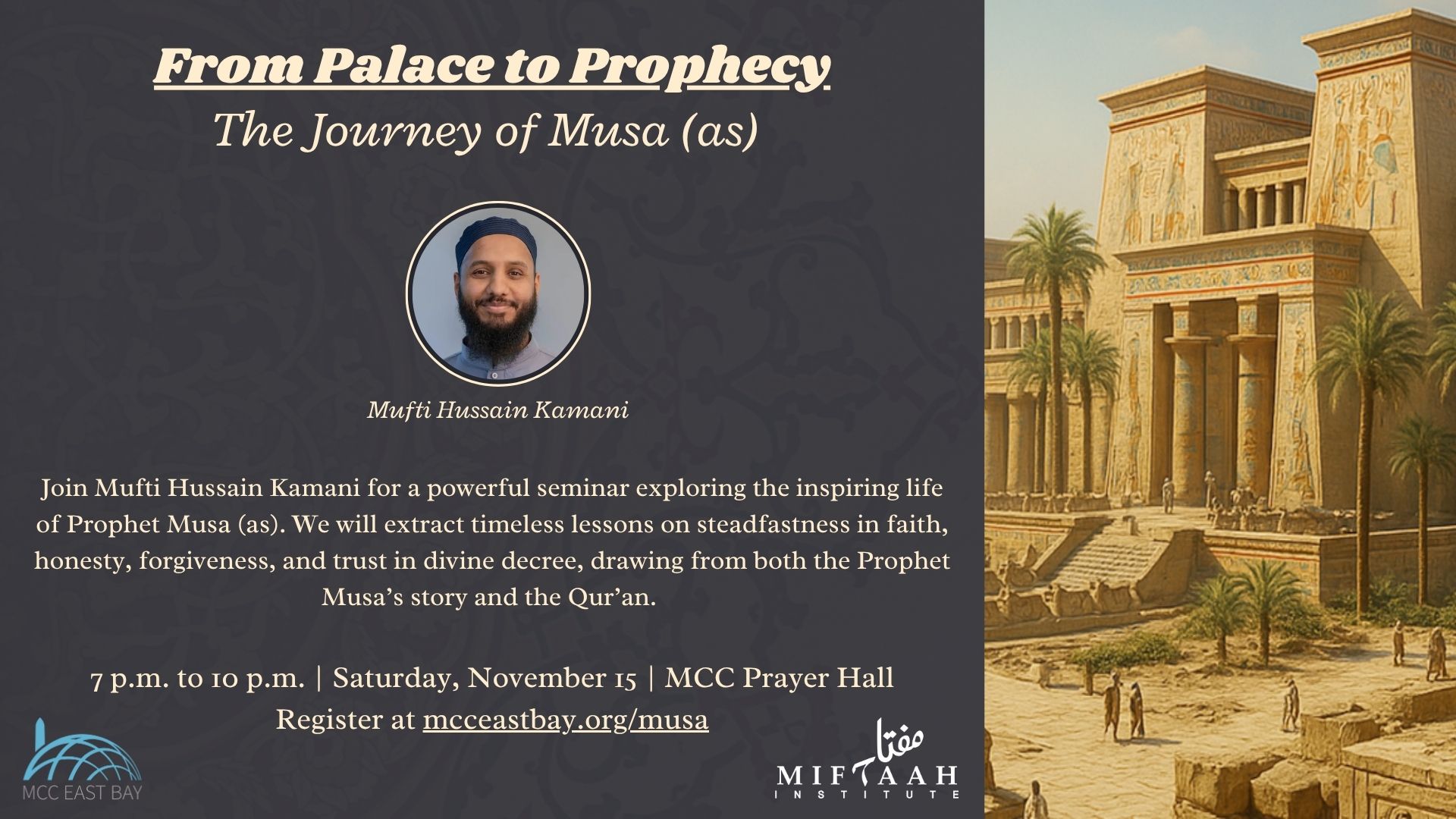 From Palace to Prophecy: The Journey of Musa ï·º | Mufti Hussain Kamani Nov 15 7:00 pm - 10:00 pm From Palace to Prophecy: The Journey of Musa ï·º | Mufti Hussain Kamani