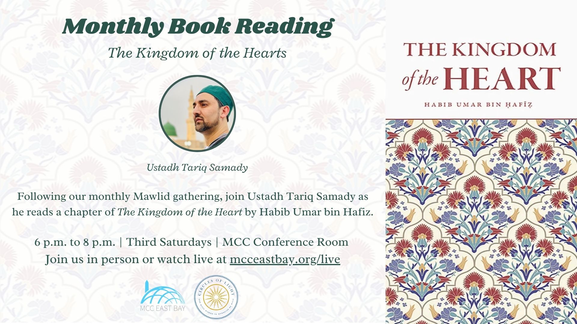 Monthly Book Reading: The Kingdom of the Hearts | Ustadh Tariq Samady Dec 20 Featured 6:00 pm - 8:00 pm Monthly Book Reading: The Kingdom of the Hearts | Ustadh Tariq Samady