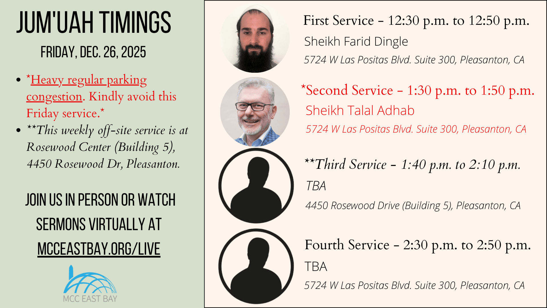 Jumu’ah Services @ MCC & Rosewood Dec 26 Featured 12:30 pm - 2:50 pm Jumu’ah Services @ MCC & Rosewood