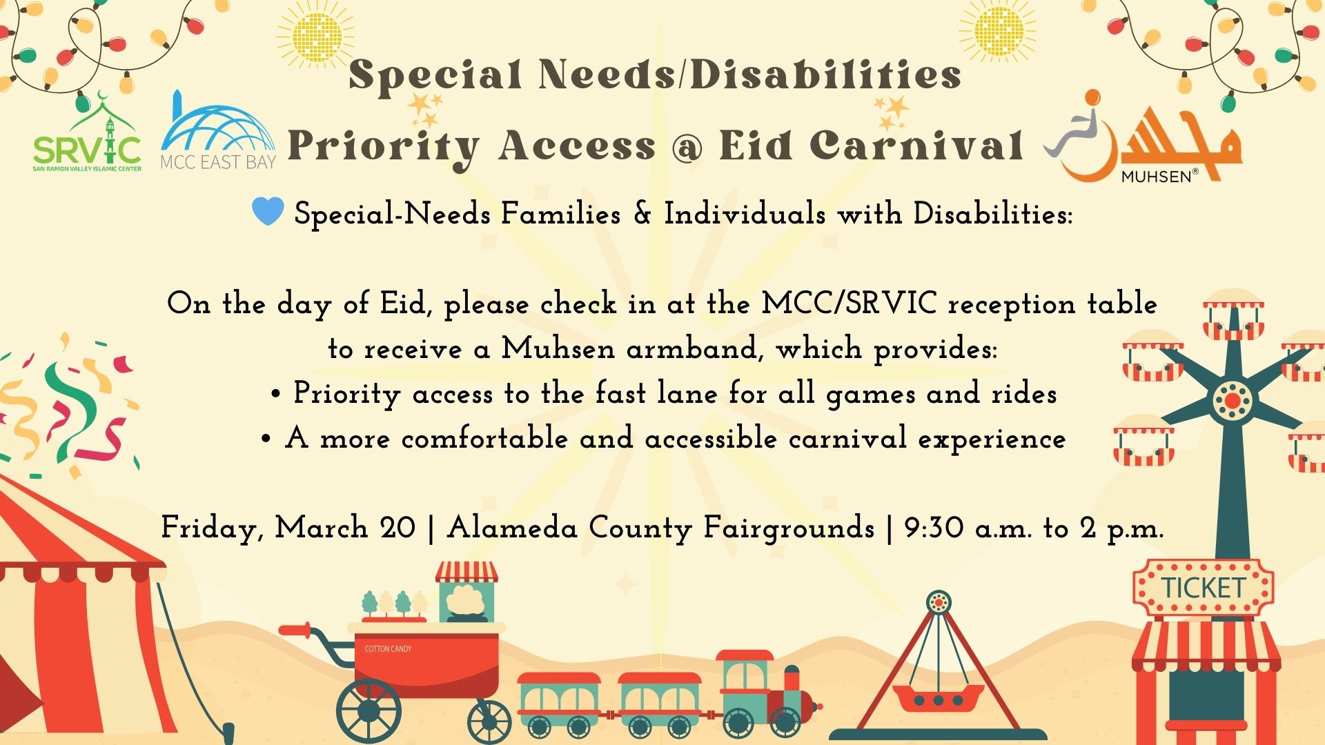 Special-needs families: please check in at the SRVIC/MCC reception table for a special Muhsen armband that grants priority access to games.