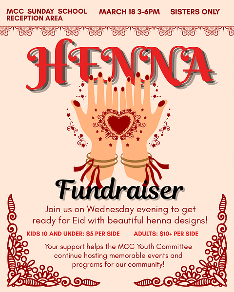 Sisters! Join us on Wednesday evening to get ready for Eid with beautiful henna designs! Henna is $5 per side for kids 10 and under, and $10 and up per side for adults. Bakhoor gift boxes will also be available for 5$. Your support helps the MCC Youth Committee continue hosting memorable events and programs for our community!Â